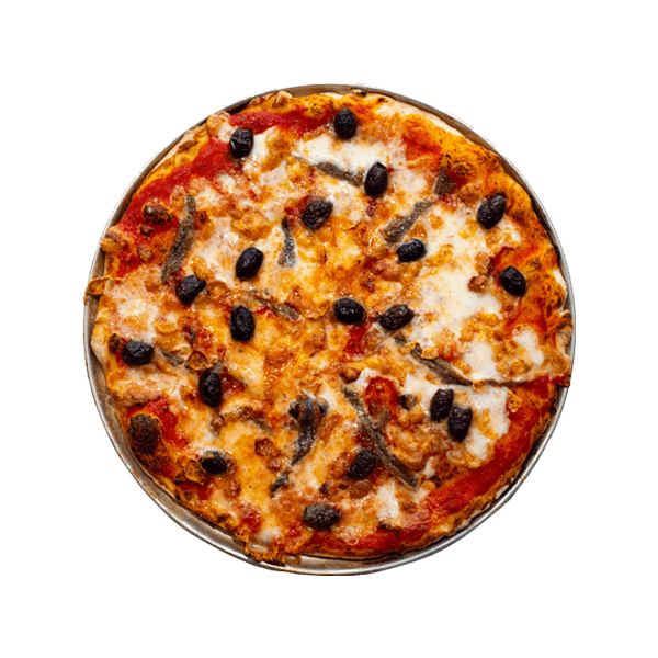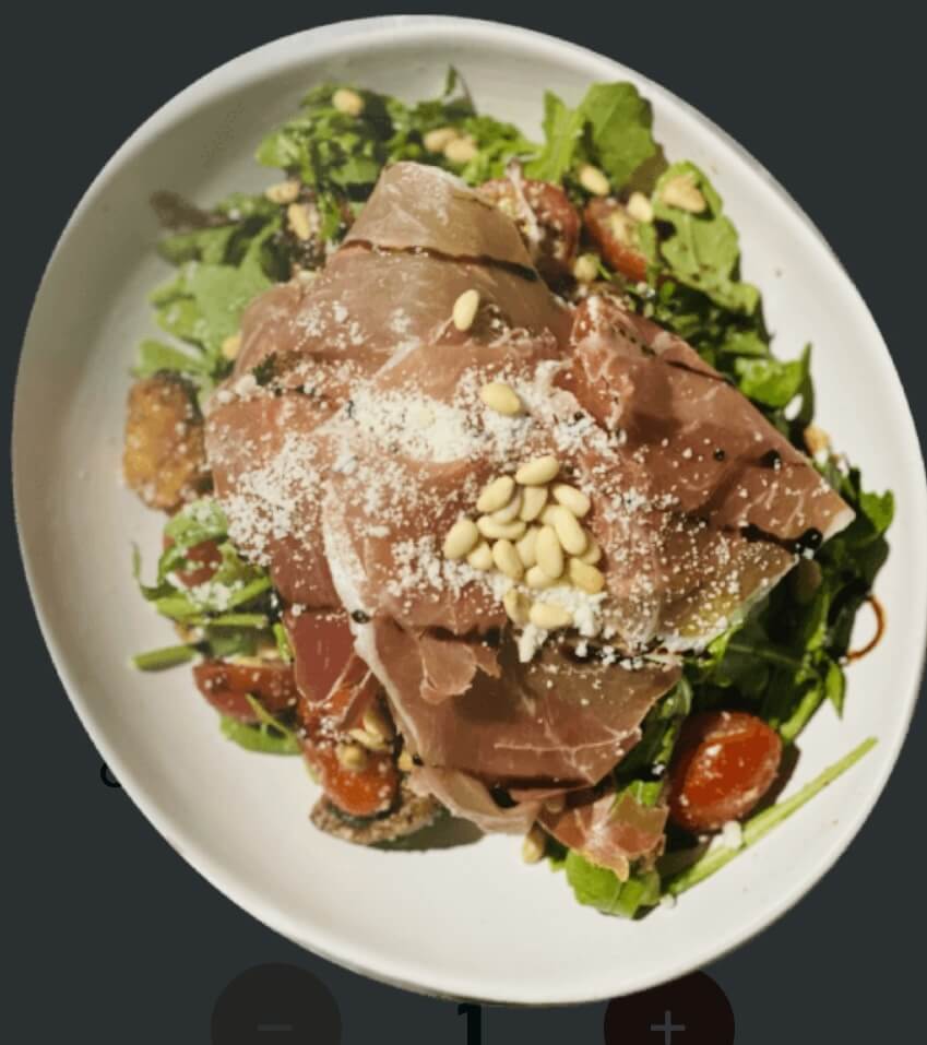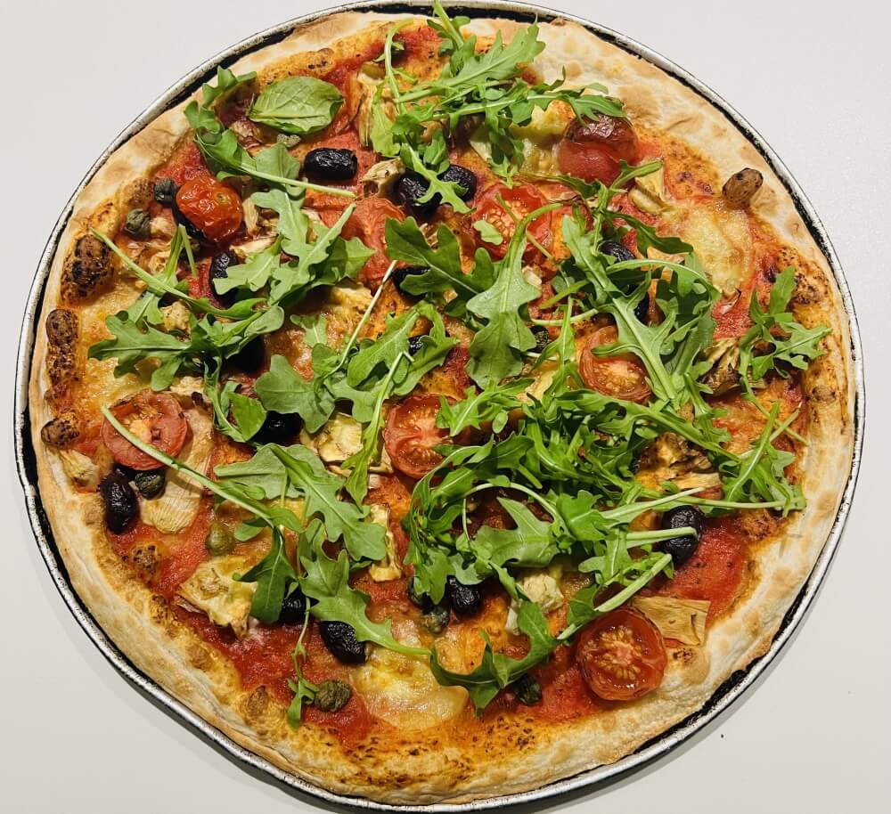 Olives, Capers, Artichoke, Cherry tomatoes and onions, topped with Rocket & Fresh Smoked Buffalo Mozzarella