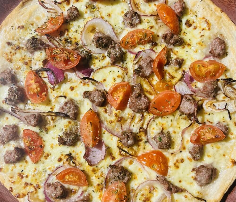 Lamb and Rosemary sausage, oregano, red onion, mozzarella, lemon zest and cherry tomatoes