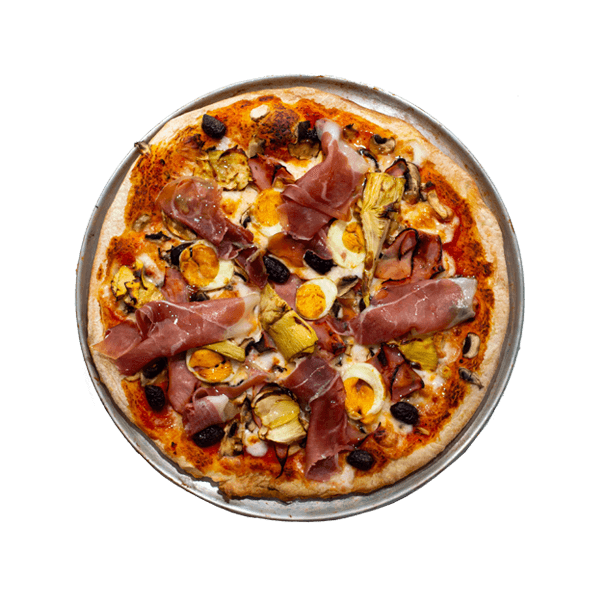 Ham, Olives, Mushrooms, Artichokes, Boiled Egg, Prosciutto, Mozzarella