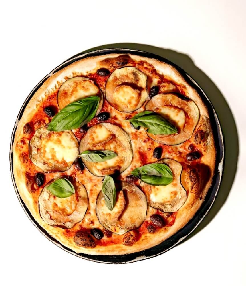 Eggplant, olives, smoked scamorzza cheese, mozzarella and basil