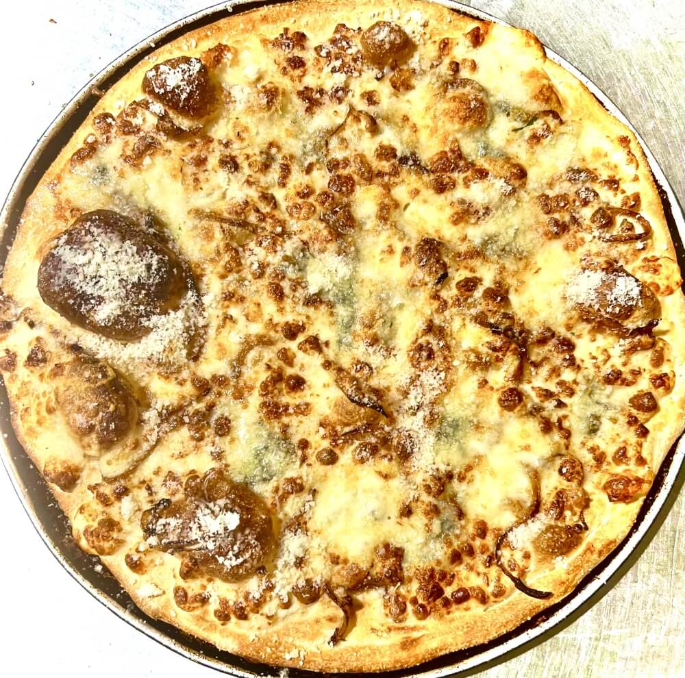 Gorgonzola, provolone, parmigiana with caramelised onions & mozzarella