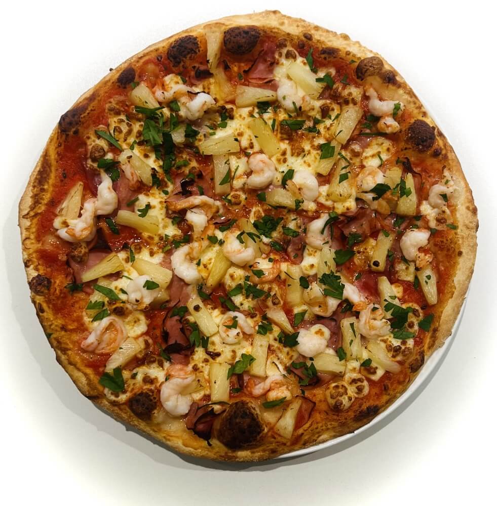 Ham and pineapple with prawns and mozzarella topped with fresh parsley